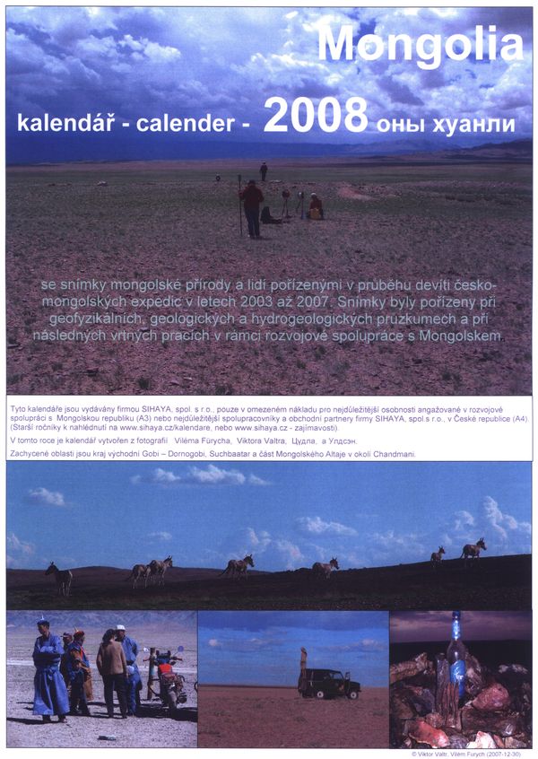 Kalendář 2008 společnosti SIHAYA je souborem fotografií ze sedmi expedic do Mongolska (z let 2003 až 2008). Hlavním cílem expedic byl výzkum vodních zdrojů ve východogobijském ajmaku, v Suchbaataru, v oáze Buchel18 a geologické mapování v Altaji. Kalendář 2008 - MONGOLSKO - pro VIP zákazníky firmy SIHAYA je inspirován tematikou krajin a lidí z odlehlých oblastí polopouště Gobi a mongolského Altaje. Následující fotografie z kalendáře popisují příběhy geologického mapování geofyzikálními metodami a nalezení vodních zdrojů v místech, kde voda chybí nejvíce. (Náklad VIP kalendáře pro osobnosti angažované v rozvojové pomoci ve formátu A3+ je limitován na 30 výtisků, náklad VIP kalendáře (formát A4) je limitován na 20 výtisků. Fotografie není možno používat pro reklamní a obchodní účely bez souhlasu vydavatele):